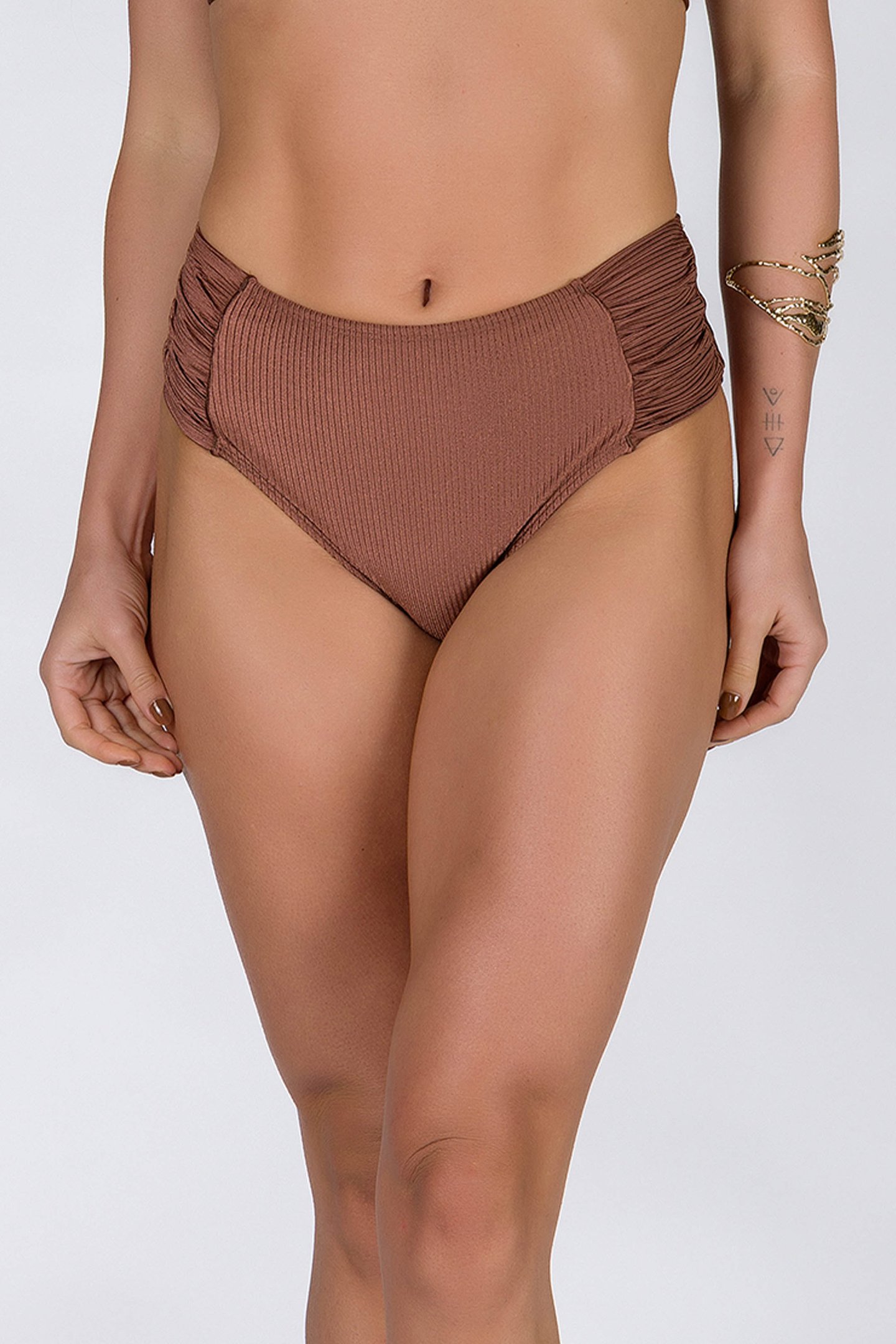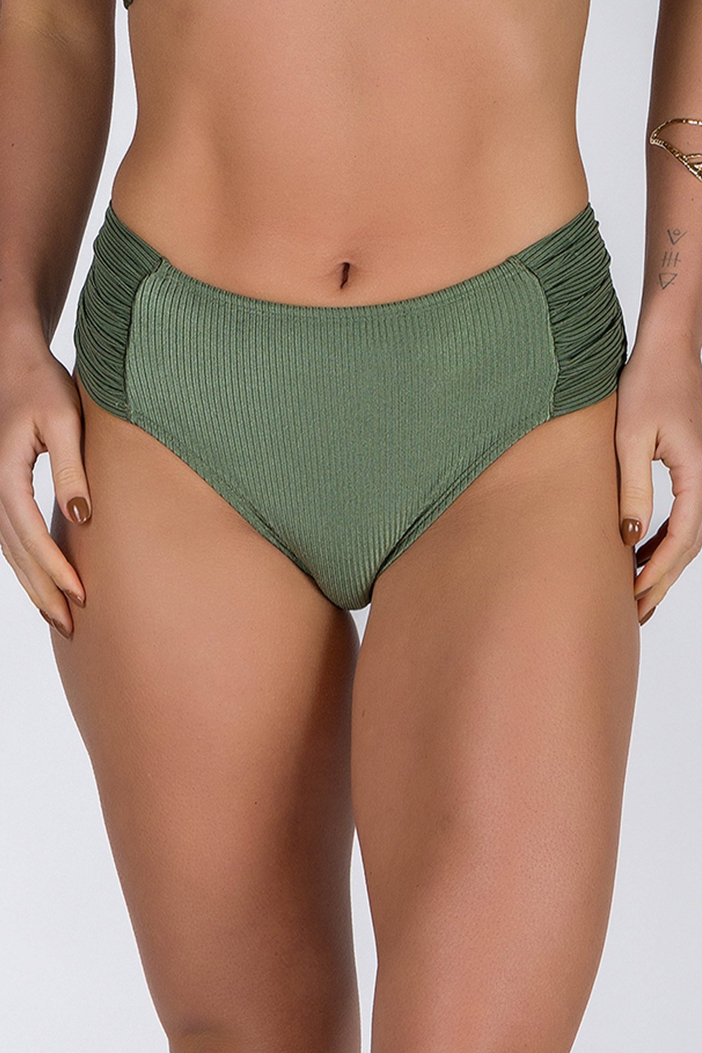Confeccionada em poliamida e elastano com efeito canelado e lee brilho, a peça combina resistência, elasticidade e toque macio, perfeita para compor looks de praia que unem conforto e sofisticação.